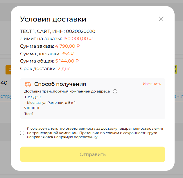 ■ Здесь требуется подтвердить согласие с условиями доставки транспортными компаниями: