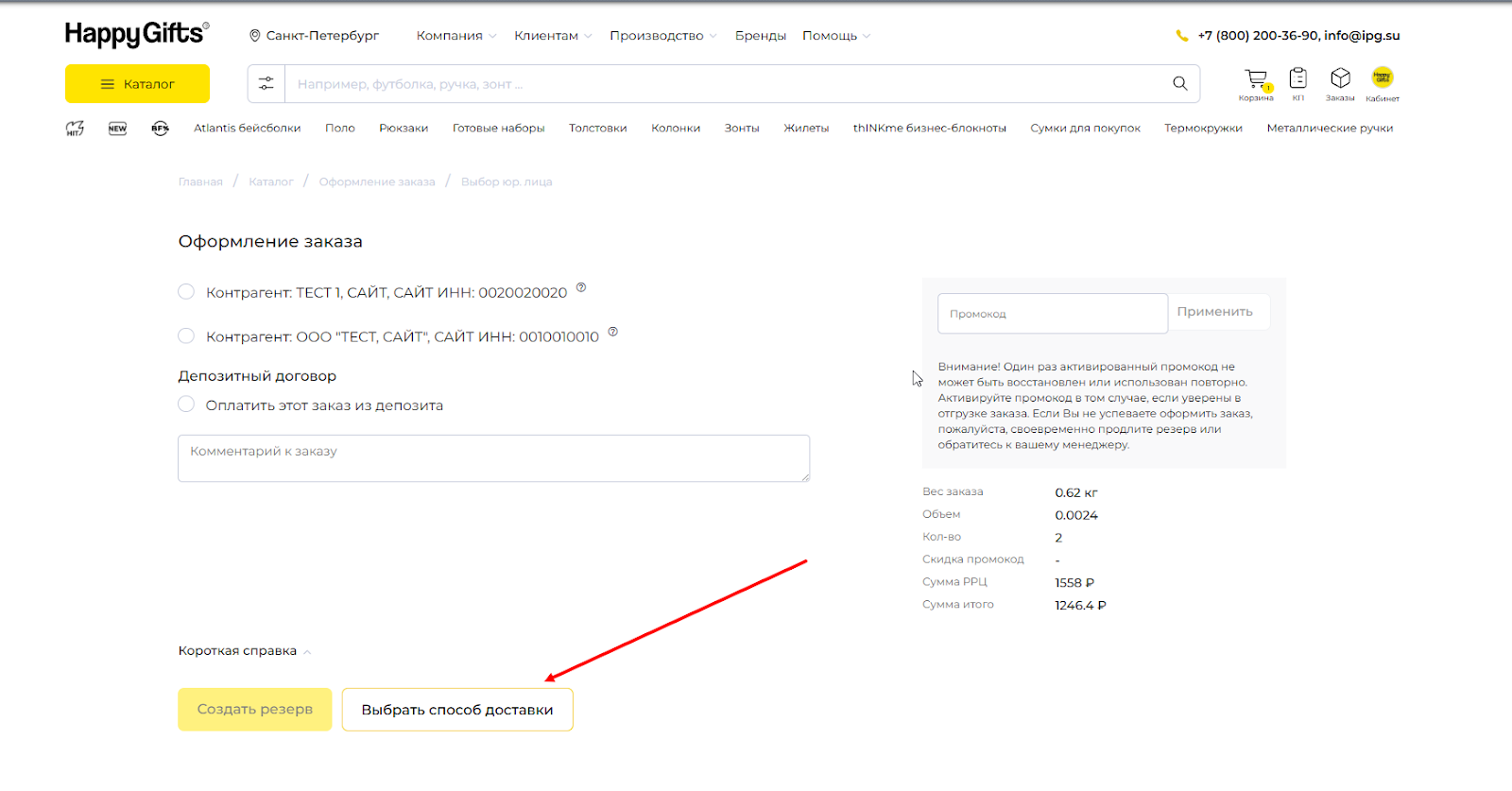 Пример выбора услуги доставки